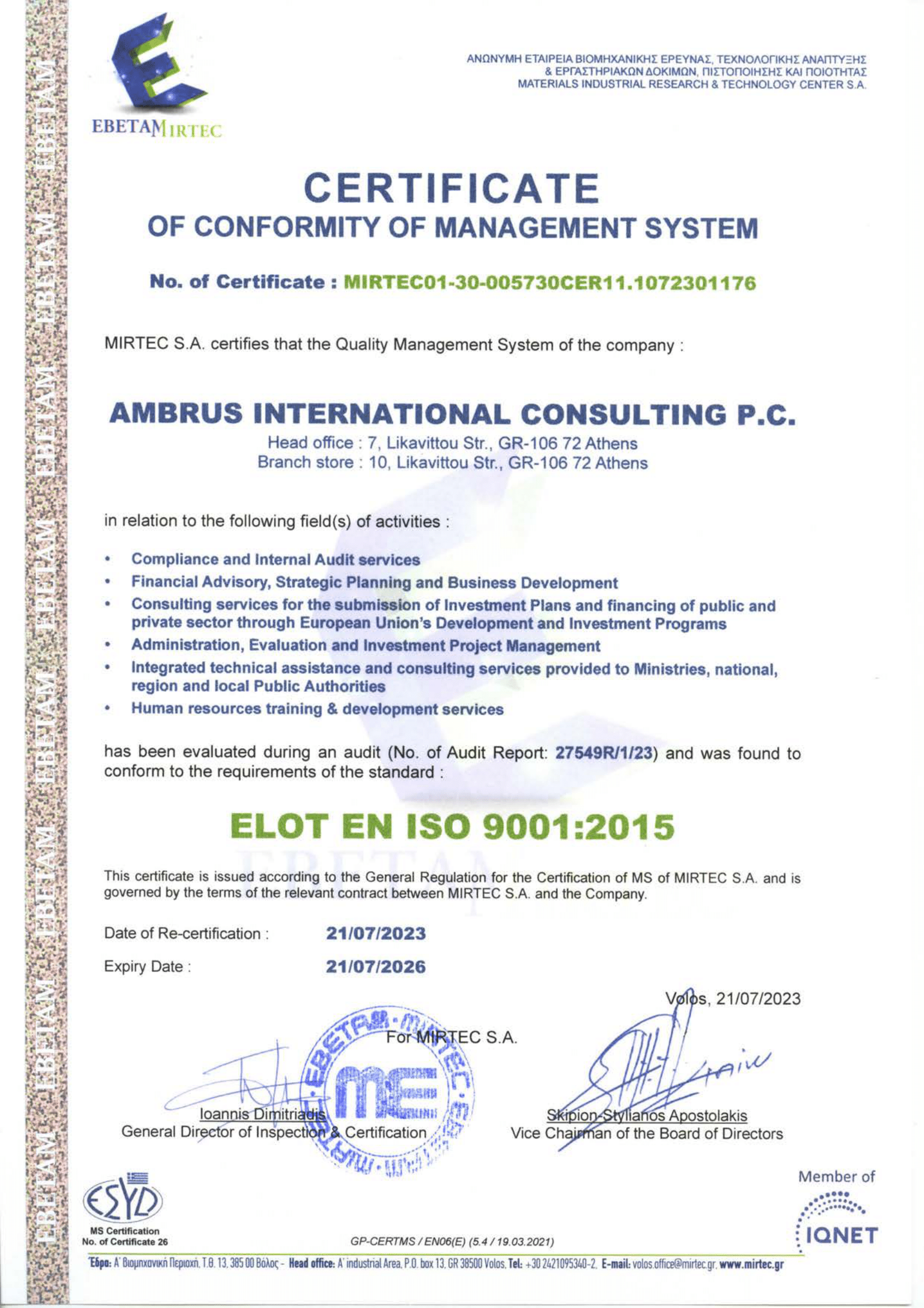 Η AMBRUS ΔΙΕΘΝΗΣ ΣΥΜΒΟΥΛΕΥΤΙΚΗ IKE εφαρμόζει Σύστημα Διαχείρισης Ποιότητας, σύμφωνα με τα πρότυπα ISO 9001:2015, ISO 14001:2015, ISO 27001:2013 και ISO 37001:2017, που καλύπτει όλες τις δραστηριότητες παροχής συμβουλευτικών και μελετητικών υπηρεσιών. Ενδεικτικά, αναλαμβάνει την υποστήριξη επιχειρήσεων / φορέων σε σχέση με την παροχή υπηρεσιών Κανονιστικής Συμμόρφωσης και Εσωτερικού Ελέγχου, την παροχή υπηρεσιών Χρηματοοικονομικού Συμβούλου, Στρατηγικού Σχεδιασμού και Οργάνωσης των Επιχειρήσεων, την παροχή συμβουλευτικών υπηρεσιών κατάθεσης Επενδυτικών Σχεδίων πάσης φύσεως και χρηματοδότησης των Οργανισμών δημοσίου και ιδιωτικού τομέα, τη Διοίκηση, Διαχείριση και Αξιολόγηση Επενδυτικών Προγραμμάτων & Έργων την παροχή υπηρεσιών εκπαίδευσης και ανάπτυξης του ανθρώπινου δυναμικού κ.α.