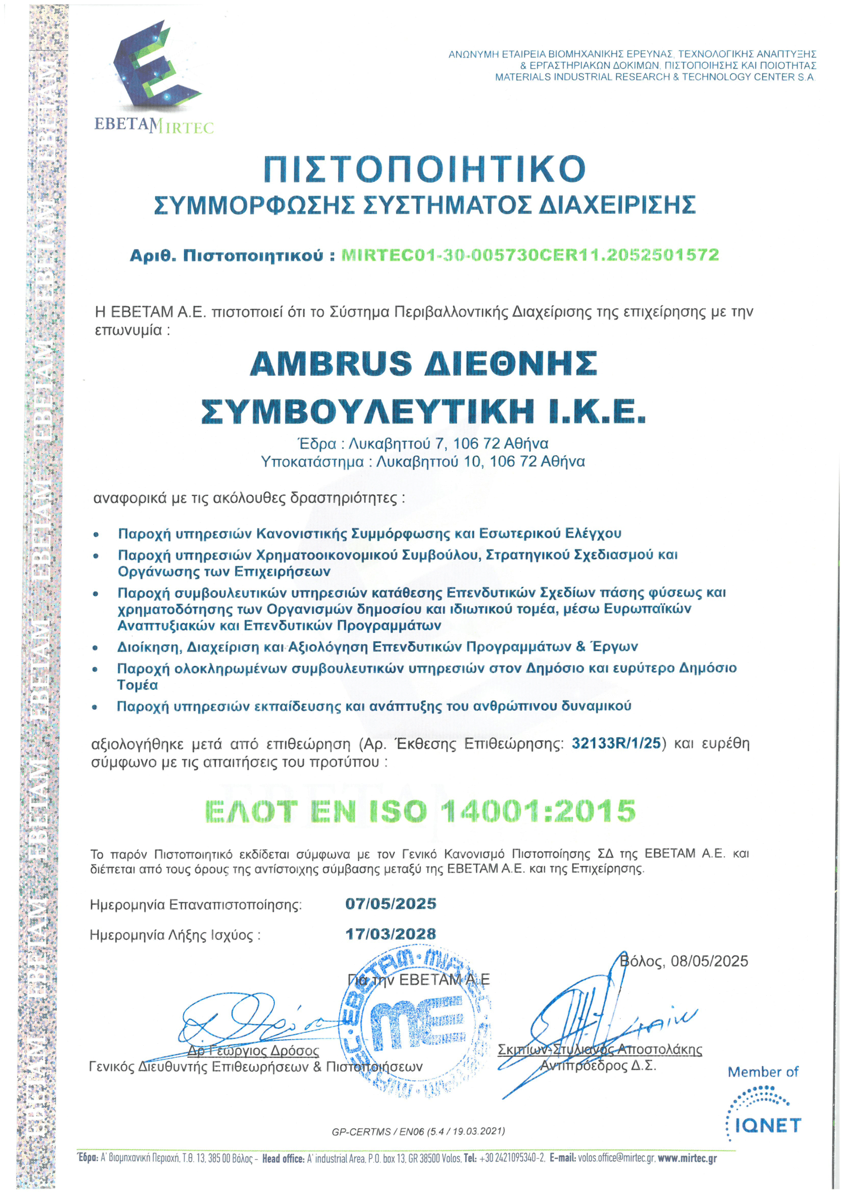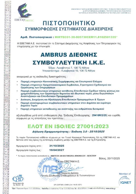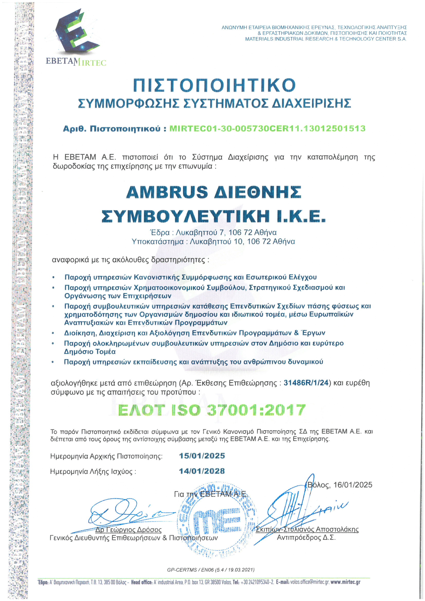 Η AMBRUS ΔΙΕΘΝΗΣ ΣΥΜΒΟΥΛΕΥΤΙΚΗ IKE εφαρμόζει Σύστημα Διαχείρισης Ποιότητας, σύμφωνα με τα πρότυπα ISO 9001:2015, ISO 14001:2015, ISO 27001:2013 και ISO 37001:2017, που καλύπτει όλες τις δραστηριότητες παροχής συμβουλευτικών και μελετητικών υπηρεσιών. Ενδεικτικά, αναλαμβάνει την υποστήριξη επιχειρήσεων / φορέων σε σχέση με την παροχή υπηρεσιών Κανονιστικής Συμμόρφωσης και Εσωτερικού Ελέγχου, την παροχή υπηρεσιών Χρηματοοικονομικού Συμβούλου, Στρατηγικού Σχεδιασμού και Οργάνωσης των Επιχειρήσεων, την παροχή συμβουλευτικών υπηρεσιών κατάθεσης Επενδυτικών Σχεδίων πάσης φύσεως και χρηματοδότησης των Οργανισμών δημοσίου και ιδιωτικού τομέα, τη Διοίκηση, Διαχείριση και Αξιολόγηση Επενδυτικών Προγραμμάτων & Έργων την παροχή υπηρεσιών εκπαίδευσης και ανάπτυξης του ανθρώπινου δυναμικού κ.α.